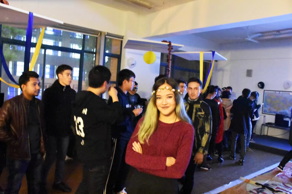 一个简单的小游戏,就把在场所有人的情绪都调动了起来,而接下来的热舞环节更是成为整个晚会的高潮。大家自发地在场地中间围城一个圈,高颜善舞的留学生一上来就跟着音乐热情舞动起来,并不断邀请在场周围的同学一起共舞。慢慢地,大家的情绪也被感染,互相结伴着走到场地中央,随着音乐一起摇摆,不仅有两人相互的尬舞,也有和留学生一起的排舞,惹得现场欢呼声阵阵。