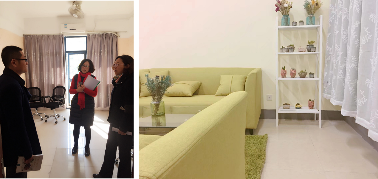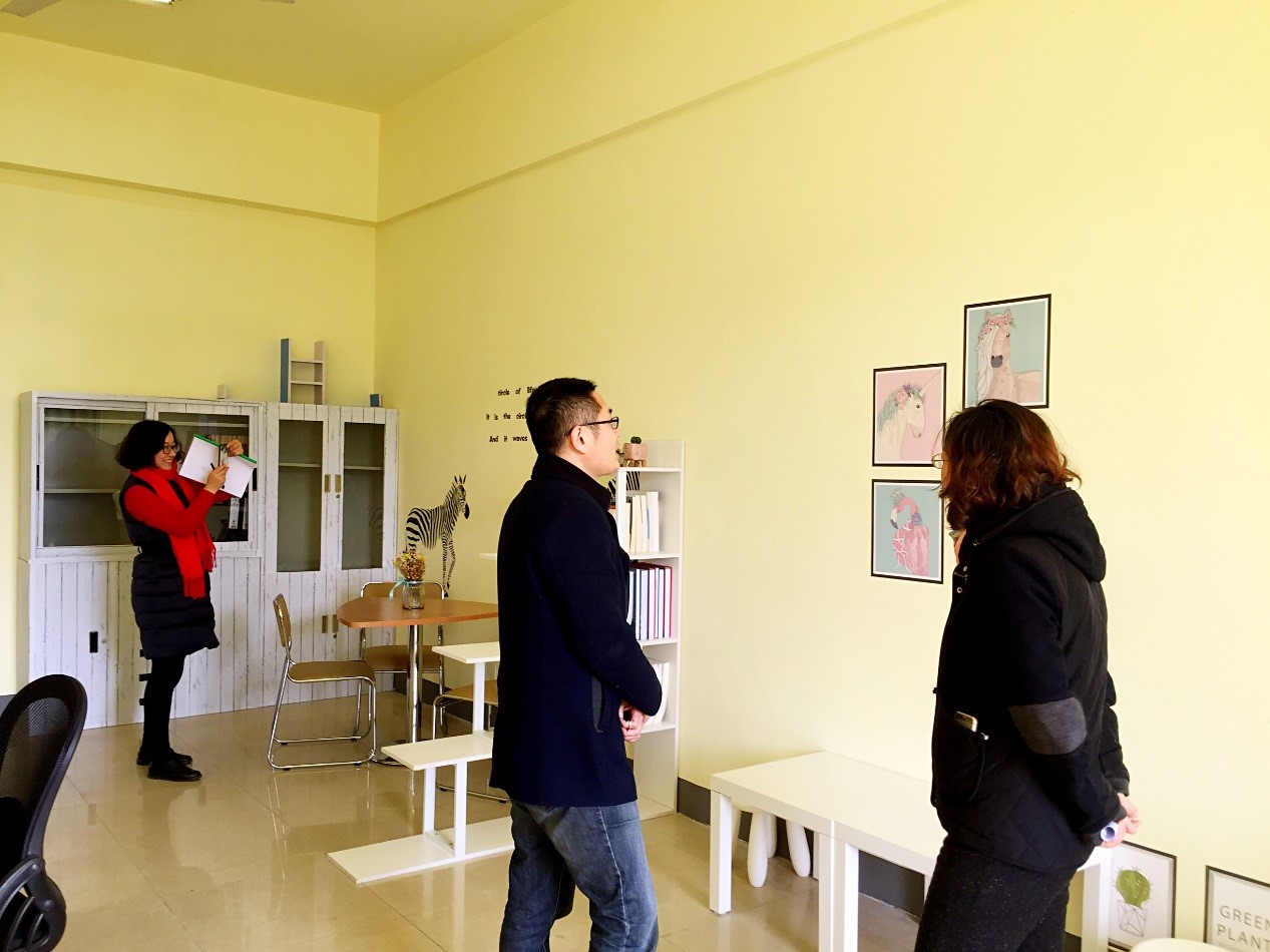 兰苑作为参观的首站,老师们首先肯定了工作站位置的选择——设置在学生公寓中的工作站能够更加便利同学们在宿舍进行谈心谈话咨询,提高解决心理问题的效率和效果,接着,一行人又验收了位于教一的心理工作站点。从沙发、屏风、书柜到角落的贴纸,绿植和别具匠心灯具,都收获了验收组老师们的一致肯定。冬日的暖阳斜洒进室内,柔和的光线,简单随意却不失设计的小物件,哪怕只是门框上的动物贴纸,都反应出了海外教育学院对工作站建设的良苦用心。验收组的老师们也一致称赞心理工作站所营造的温馨、和谐、友爱的氛围,认为学生在这里能够得到完全的放松,更好的实现心理健康的教育工作。接着,验收组老师们针对学院心理工作站建设上存在的不足提出了宝贵的意见,认为通过后期由心理健康教育与咨询中心适当指导添加一些专业书籍,能够使工作站更加专业化和职能化。最后,校心理健康教育与咨询中心的老师们还站在专业的角度上,针对学院工作站建设和日后的发展运营做了相关指导。