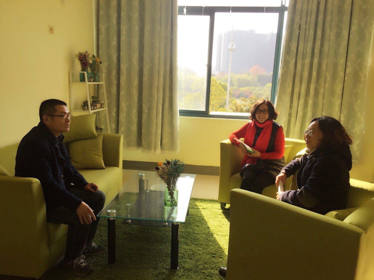 2017年11月20日上午,学生处副处长葛敏、校心理健康教育与咨询中心陆晓花等一行莅临学院心理工作站进行验收指导工作,海外教育学院党委副书记徐磊和学院心理联系员宋贞臻热情接待。