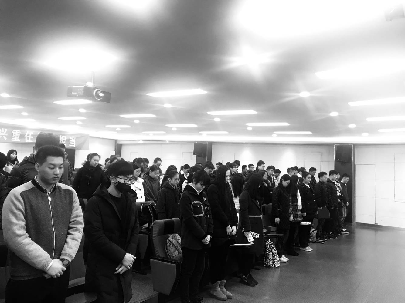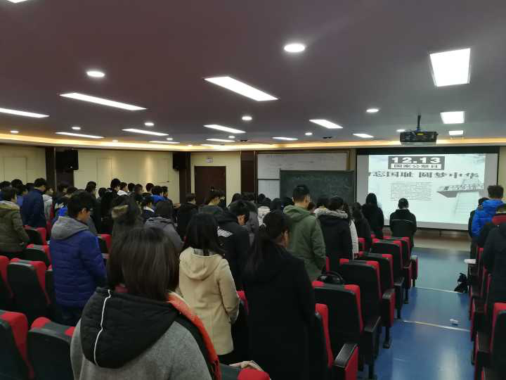 10:01分整,南京邮电大学海外教育学院组织学生于教1-300教室集体默哀一分钟。随着哀婉凄厉的警报声,师生共同为南京大屠杀死难同胞默哀,深切缅怀南京大屠杀的无辜死难者和为了抗日战争的胜利献出生命的革命先烈和民族英雄。