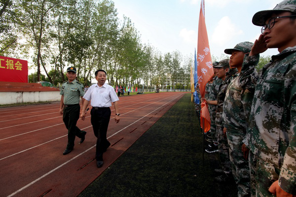 王宗荣副校长在选培办邢锐干事的陪同下检阅了各个军训方队的学生。“同学们好!”“校长好!”“同学们辛苦了!”“为人民服务!”的声音此起彼伏,回响在南操场上空。