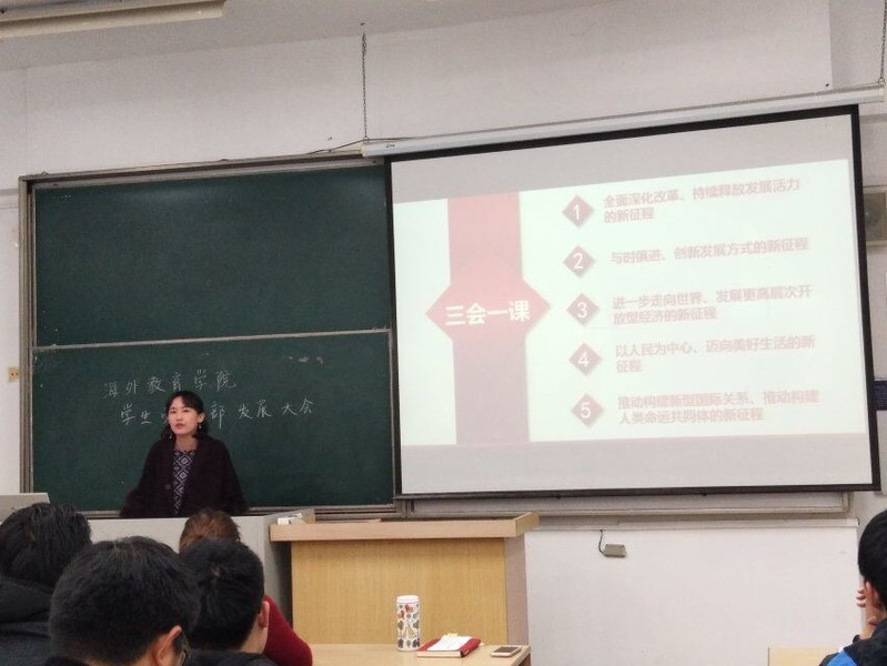 2018年11月21日,南京邮电大学海外教育学院学生党支部“三会一课”学习大会在教一110室举行。海外教育学院党委副书记徐磊、学生党支部书记包莉、学生党支部副书记宋贞臻、组织干事赵珂、青年委员钱龙以及全体学生党员、党的发展对象参加了会议。本次大会主题为学习习近平总书记在APEC会议上的重要讲话。