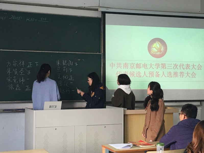 2018年11月23日,海外教育学院“中共南京邮电大学第三次代表大会代表候选人预备人选推荐大会”在教一110顺利召开。院党委副书记徐磊,学生党支部书记包莉,组织干事赵珂,青年委员钱龙以及海外教育学院学生党支部全体正式党员和预备党员参加了此次会议。