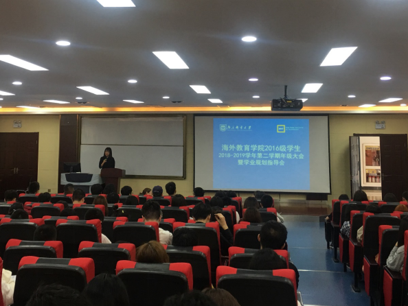 2019年5月20日,海外教育学院2016级学生在教1-300召开了2018-2019学年第二学期年级大会暨学业规划指导会。学院党委副书记徐磊老师及部分2015级优秀毕业生代表出席了会议,2016级辅导员宋贞臻老师主持本次会议。