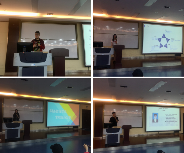 接着,2015级优秀毕业生代表朱贤圣、邹希慧、潘雨昕、朱懿阳同学分别结合自身实际情况,从国外申研、国内考研和就业三个方面与2016级的同学进行了经验分享。朱贤圣同学就出国读研需要的准备做了介绍,着重介绍在申请学校的过程中绩点、托福和GRE等硬条件和软背景的重要性,提醒大家要从多维度或高深度进行准备。邹希慧同学分享了自己在国内考研的经历,希望各位准备考研的同学既能提起勇气、也不盲目自信,根据个人实际情况和方向选择目标学校。邹希慧同学主要从时间规划、学习效率、学习前人经验和摆正心态四个方面进行了分享。潘宇昕同学就大四应届生的求职进行了详细介绍,着重强调求职时间线安排的重要性,并且提前从行业、公司和职位完成知识的储备。最后,潘雨昕同学给学弟学妹分享了求职小窍门:敢于“编”简历,精炼,突出特点;面试多梳理逻辑,“扮演”最合适的角色。院学生会主席朱懿阳同学着重强调了在求职过程中,一份充实精准、有选择性针对性、契合目标公司企业文化的简历的重要性;并鼓励2016级的同学在今年内尽量寻求一定的实习经历用来提升自己的竞争力。四位优秀毕业生展现了对大学毕业后道路的不同选择,给同学们的发展以意见参考。