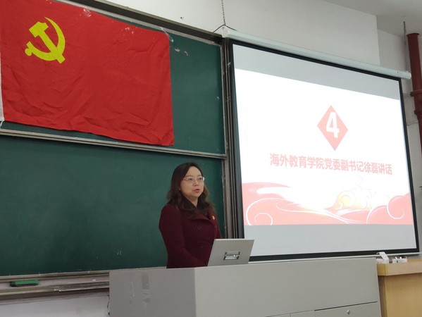会议最后,海外教育学院党委副书记徐磊要求全体党员提高政治站位,深刻认识十九届四中全会的重大意义,在日常的学习生活工作中要坚持学、系统学,确保全会精神入脑入心。徐书记勉励学生党员要不忘初心、牢记使命,坚定理想信念,树立远大理想,严守政治纪律,努力学习奋斗,积极服务同学,将自己的成长融入“两个一百年”奋斗目标,为实现中华民族伟大复兴的中国梦贡献青春智慧和力量。