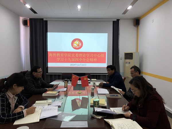 2019年11月22日,海外教育学院党委理论学习中心组在教学一号楼208会议室开展党的十九届四中全会精神专题学习。会议由院党委书记方宗祥主持。学院中心组成员参加学习会。