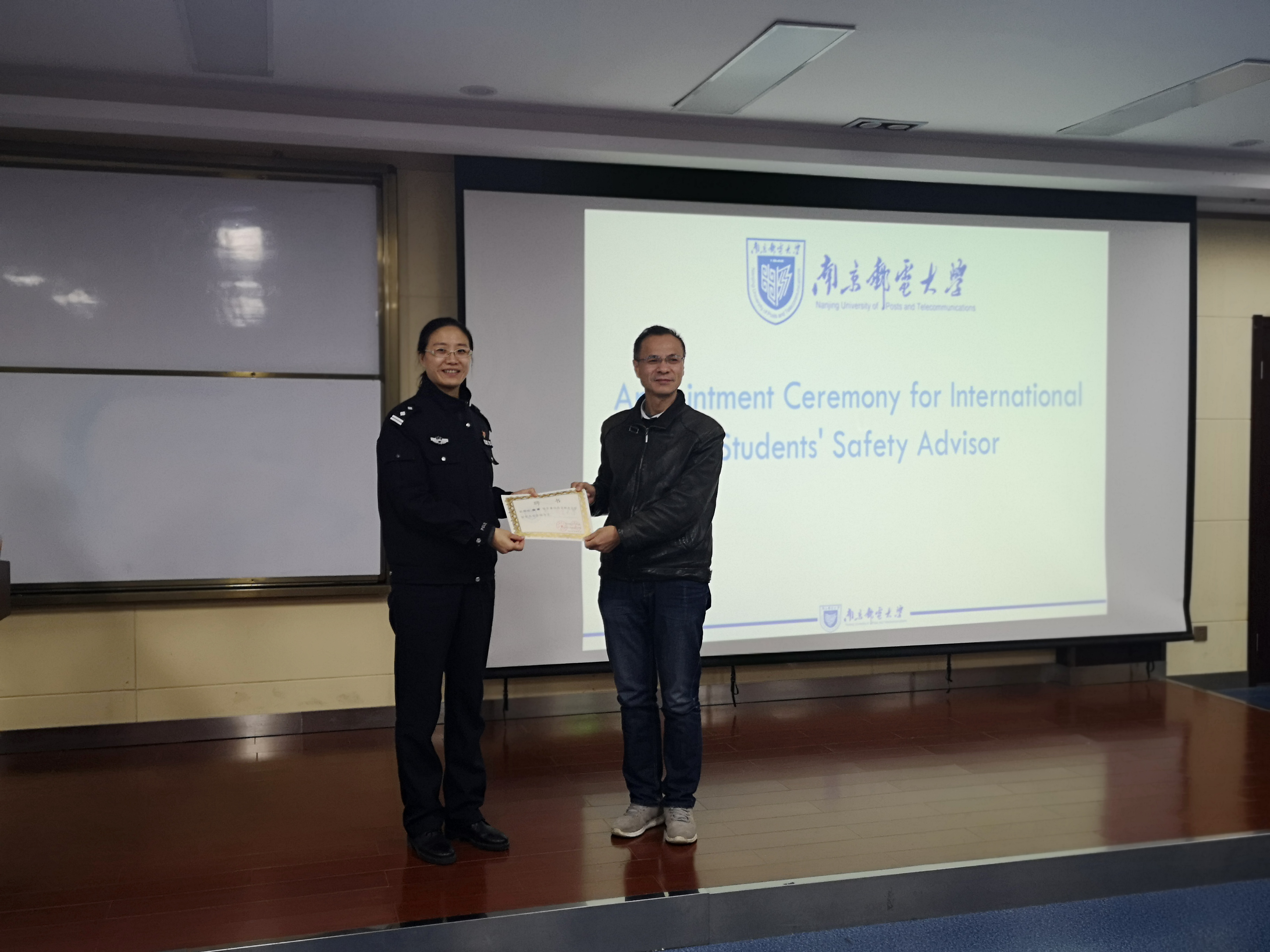 我院王保云院长代表学校向辖区仙林派出所民警徐静警官颁发了聘书,聘请徐警官担任我校留学生安全辅导员。徐警官表示,会做好派出所和学校的联系纽带,为普及留学生中国法律法规意识尽职尽责。