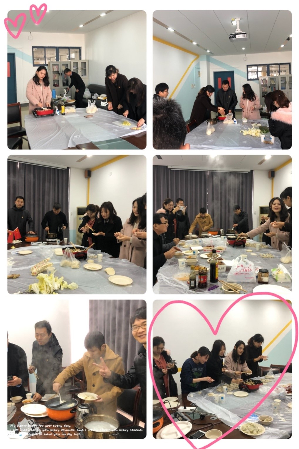 女老师们有的准备辅料,有的拌馅,有的包饺子,大家协调合作,一个个制作精美的饺子就在大家的手中诞生了。男老师们负责烧水准备煮饺子,欢声笑语中,小小的会议室气氛一片温馨。终于,在大家的共同努力下,一碗碗热气腾腾的饺子出锅了。大家享受着自己的劳动成果,感受着学院大家庭其乐融融的气氛。教职工包饺子活动就这样圆满结束了,但是活动带给大家的温暖却留在了所有人的心间。大家都对所有老师们的辛勤付出表示感谢,并期待以后有更多这样的活动,工作之余调节气氛,增加工作乐趣。