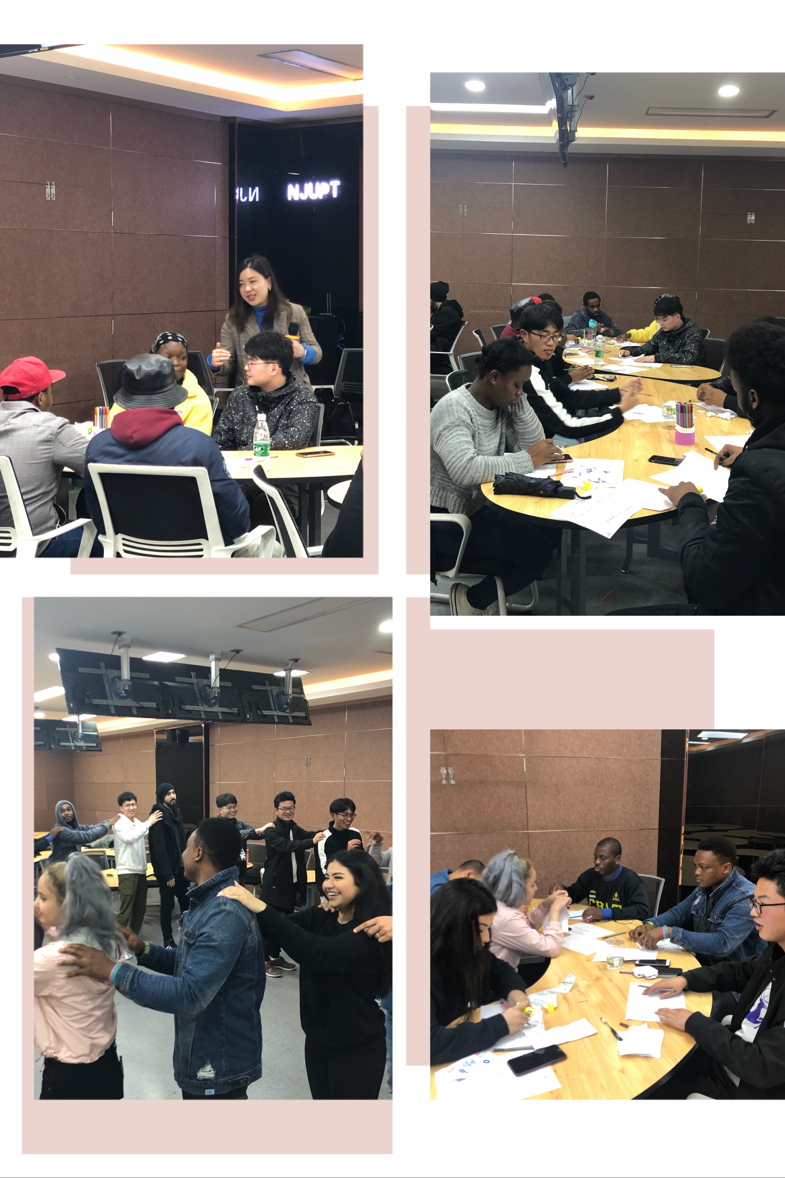 活动一开始,杨诗露老师组织学生们做起了破冰小游戏,让现场的气氛轻松热闹起来。大家按照生日月份排序,手牵手围成一个圈,建立团体契约—互相尊重和信任。接着,学生们以不同国籍、不同专业、互不相识的原则自愿组队,分成4个小组。每组学生认真思考着“我的名片”,包括:昵称、三个身份和三个描述自己的形容词。在进行深刻自我思考和愉快的介绍分享后,学生们逐渐打开了心扉。在“资源拼贴画”环节,小组之间用绘画的方式分享自己目前的心境和过往经历。活动中,学生们逐渐突破心理困扰,懂得了积极乐观面对生活的重要性。