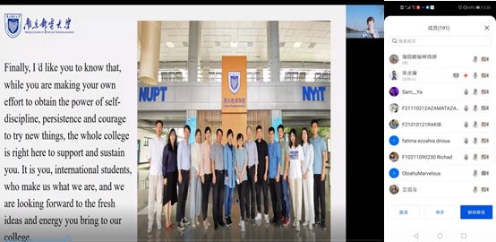9月6日,海外教育学院院长王瑛教授与全体2021级新生通过视频会议的形式见面,开启入学教育的第一课。王瑛院长代表学院对所有2021级留学生新生表示欢迎,并介绍了学校留学生教育和培养工作的情况。致辞中,王瑛院长希望全体2021级留学生新生能够积极应对疫情下的线上课程学习的挑战,不断提高自我综合素质,并为自己未来的学习和职业生涯做好规划。