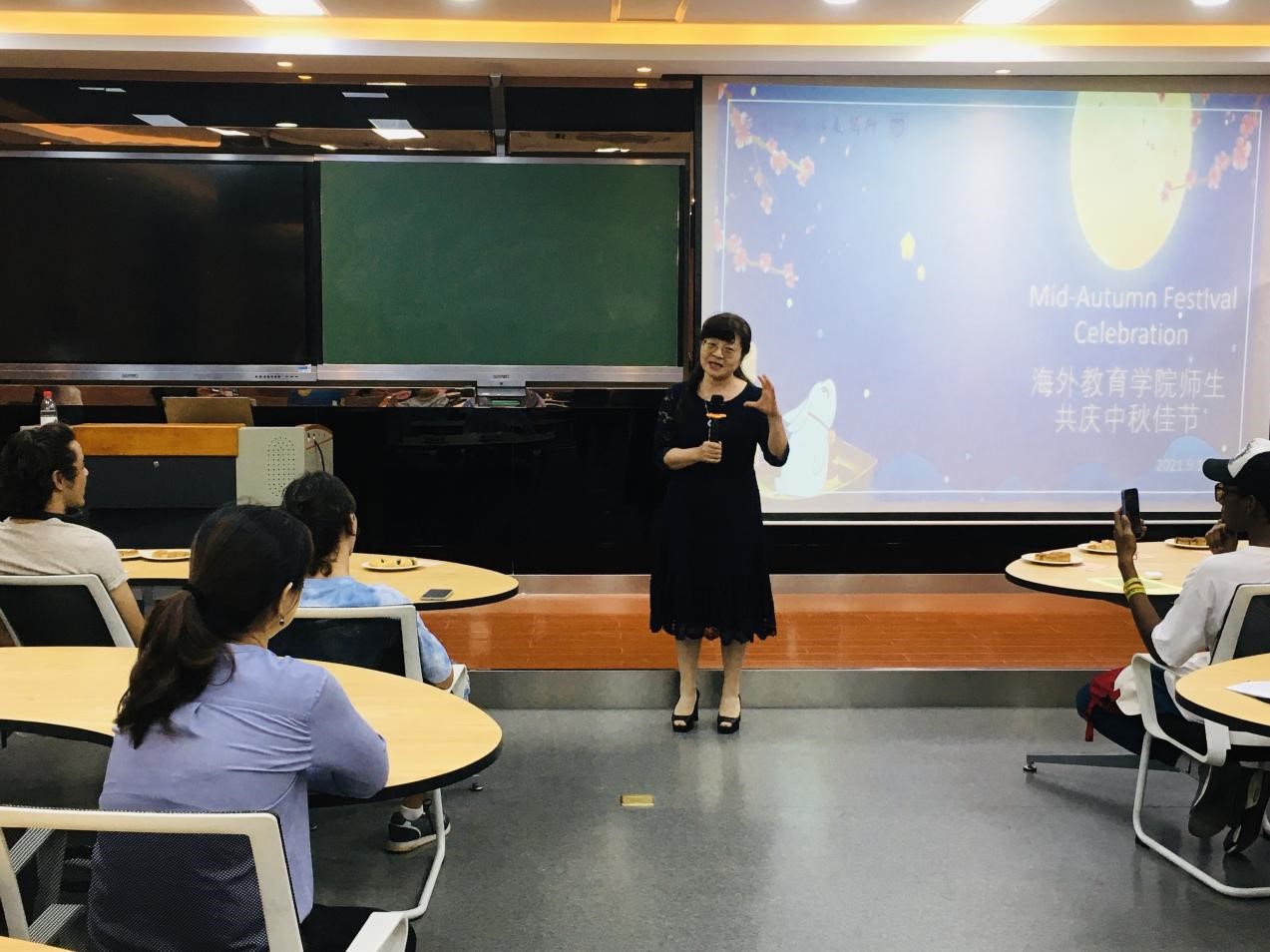 活动伊始,海外教育学院王瑛院长在致辞中提到:中秋节不仅承载着在外游子的思乡之情,还饱含着阖家团圆的美满之意。受疫情的影响,很多留学生在中国已经生活了两三年,不能回到自己的家乡与家人团聚,而学院的老师和同学们就是他们在中国的亲人。作为一个大家庭的家长,王瑛院长代表学院为每位境内和境外的留学生送上中秋佳节的美好祝福,希望通过此次活动,学生们能够更好地了解中国文化与传统节日,深切感受到“家的温暖”。