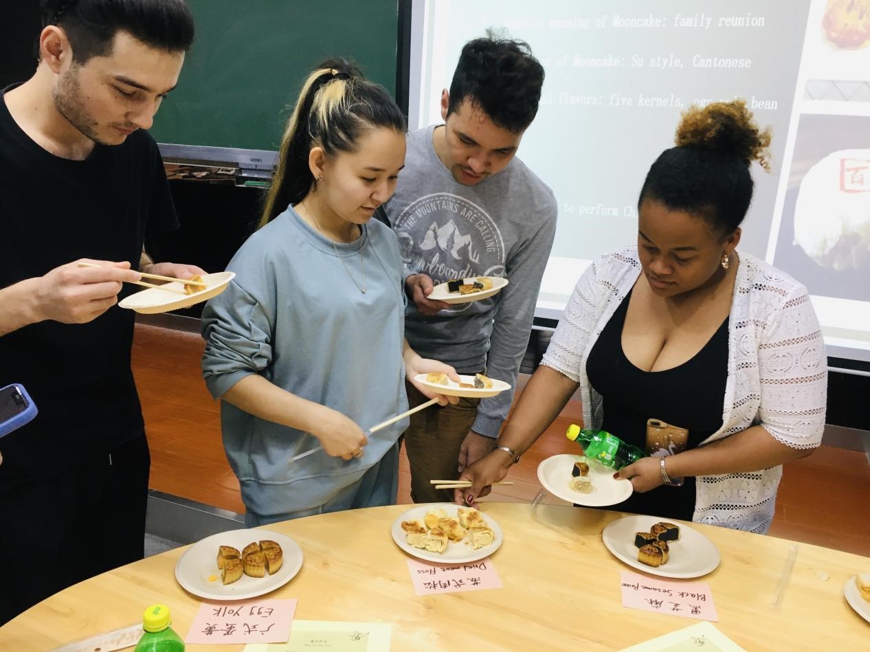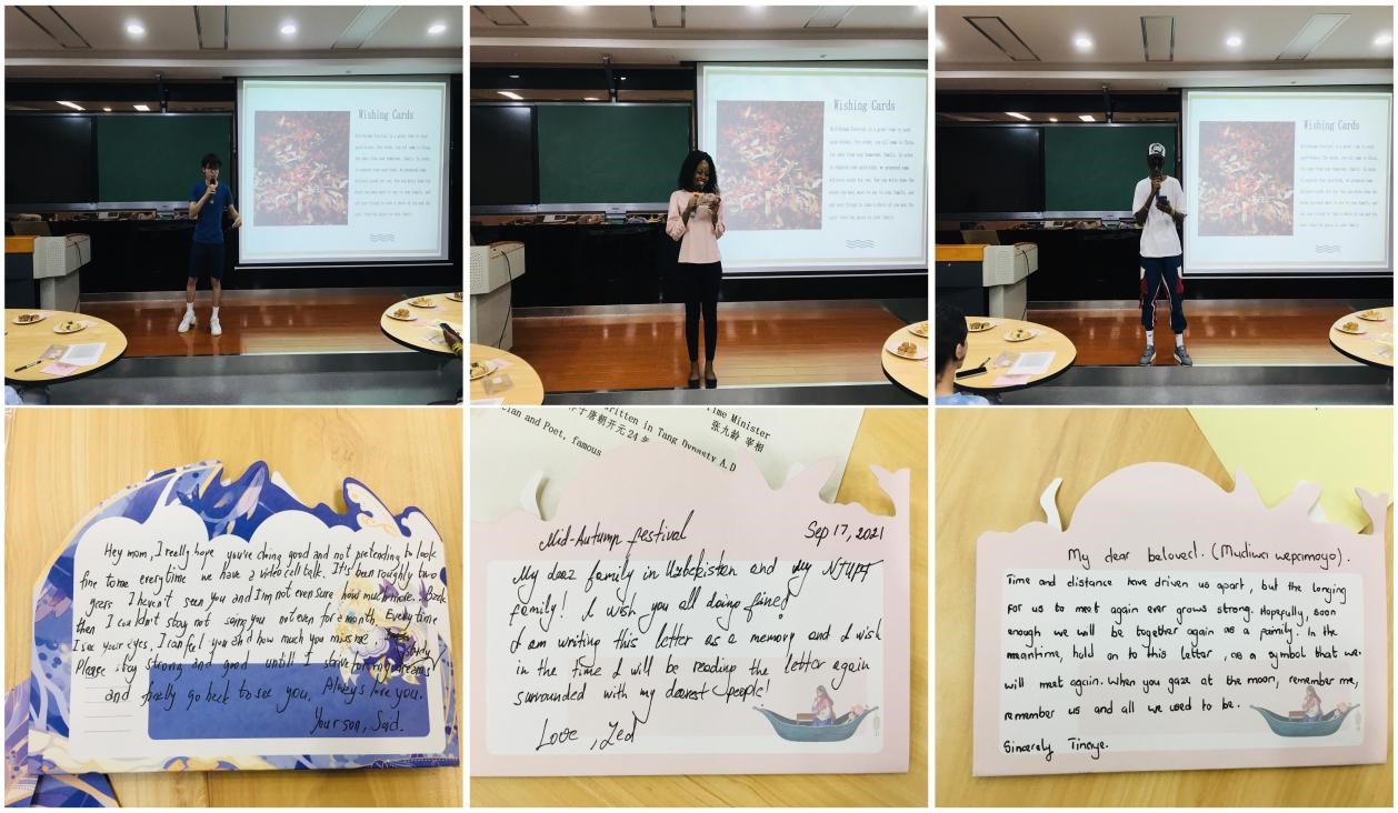 接着,学院辅导员老师们分别从“后羿射日”、“嫦娥奔月”等中国古代神话传说入手,生动的讲述了中秋节的来历与文化习俗、月饼的起源。在认真了解中秋佳节的寓意后,留学生们深有所感,纷纷在卡片上写下对家人朋友的浓浓思念和美好祝福,并通过诵读、拍照等方式将这份珍贵的心意传递。怀着对阖家团圆的期盼,师生们一起品尝了不同口味的月饼,现场洋溢着满满的温情。