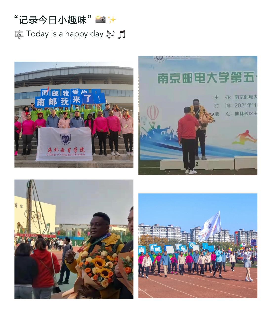 11月19-20日,南京邮电大学举行了第52届田径运动会。运动会开幕式上,海外教育学院师生身着红绿蓝三色服装,齐声高喊“南邮,我来了;南邮,我爱你”,表达了对学校的深情厚谊,赢得了大家的阵阵掌声。