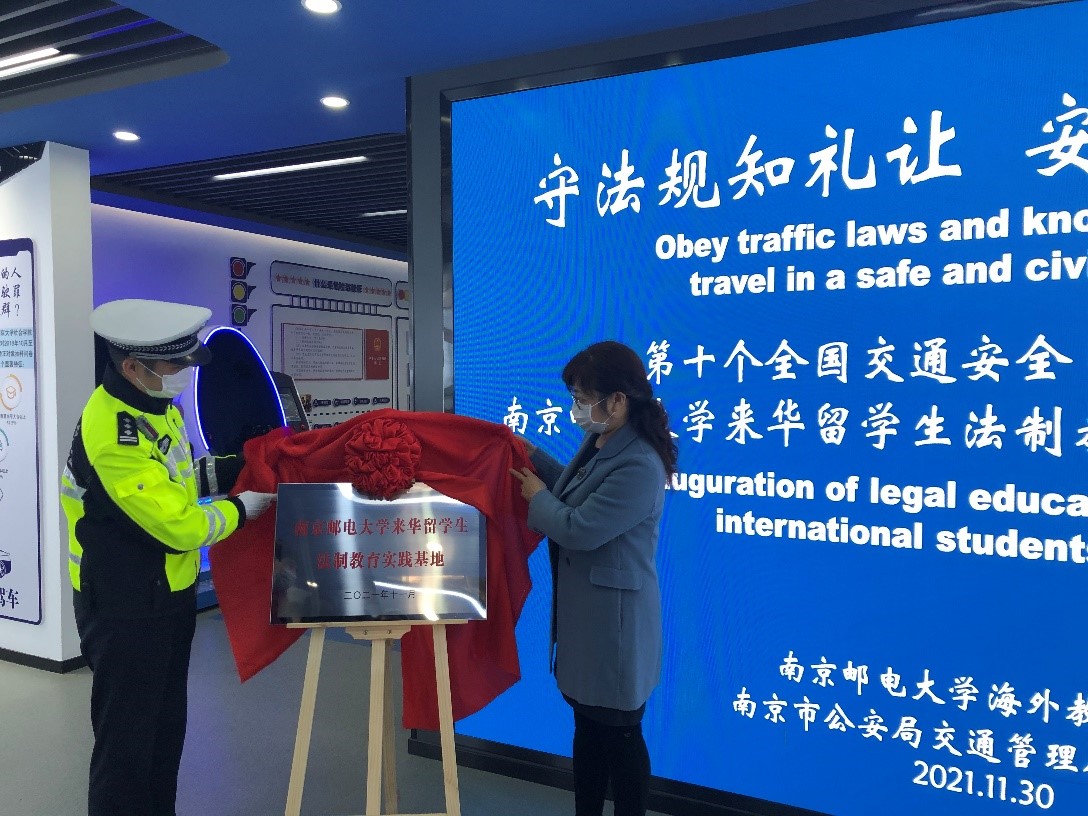 2021年11月30日下午,南京邮电大学来华留学生法制教育实践基地揭牌仪式在南京市交通安全违法犯罪警示教育基地举行。南京市交通管理局第七大队副大队长王立、南京邮电大学海外教育学院院长王瑛、副院长汤美玲共同出席了揭牌仪式。