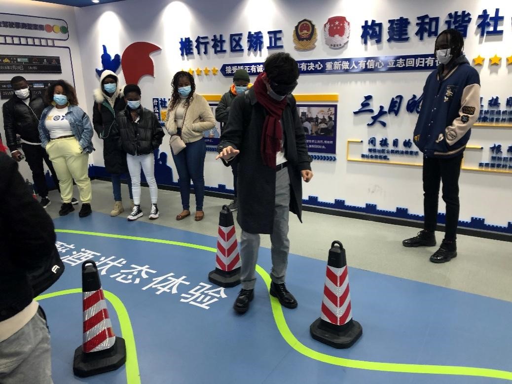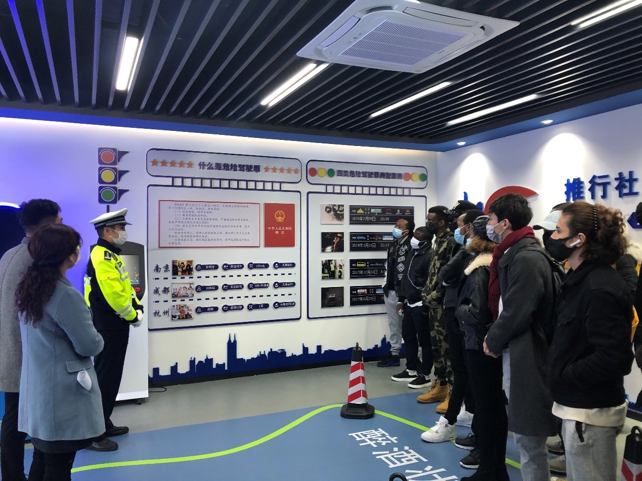 揭牌仪式后,留学生们集体参观了交通安全违法犯罪警示教育基地。在损坏严重的肇事车辆模型旁,留学生们认真聆听王立副大队长现场讲解事故案例。基地展厅内,王立副大队长向大家科普交通肇事罪、危险驾驶罪等罪行种类。留学生们现场戴上3D眼镜体验感受醉酒驾驶状态,认真观看交通肇事警示教育宣传片,深受触动,真切感受到“守法规知礼让,安全文明出行”的重要性和必要性。