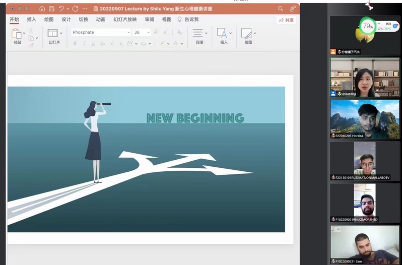 9月5日,海外教育学院院长王瑛教授与全体2022级新生通过视频会议的形式见面,讲授入学教育的第一课。王瑛院长代表学院向2022级留学生新生表示欢迎,介绍了学校留学生教育培养工作的情况,并对全体新生提出了三点要求:勇于尝试、树立目标、严于律已,希望新生们能够不断提高自我综合素质,做一个对世界发展有贡献的有为青年。