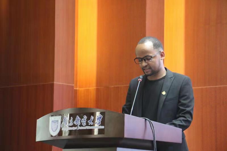2021 级计算机科学与技术专业硕士留学生Eyasu Teshome Gebremariam作为获奖代表发表感言。他在发言中提到,在南邮本科和硕士研究生学习生活的六年里,不仅获得了专业知识,而且通过参加多次社会实践和交流活动促进了个人综合能力的提升。他鼓励大家努力学习中文、提升专业水平,这样才能获得更多机会,在未来拥有无限可能。