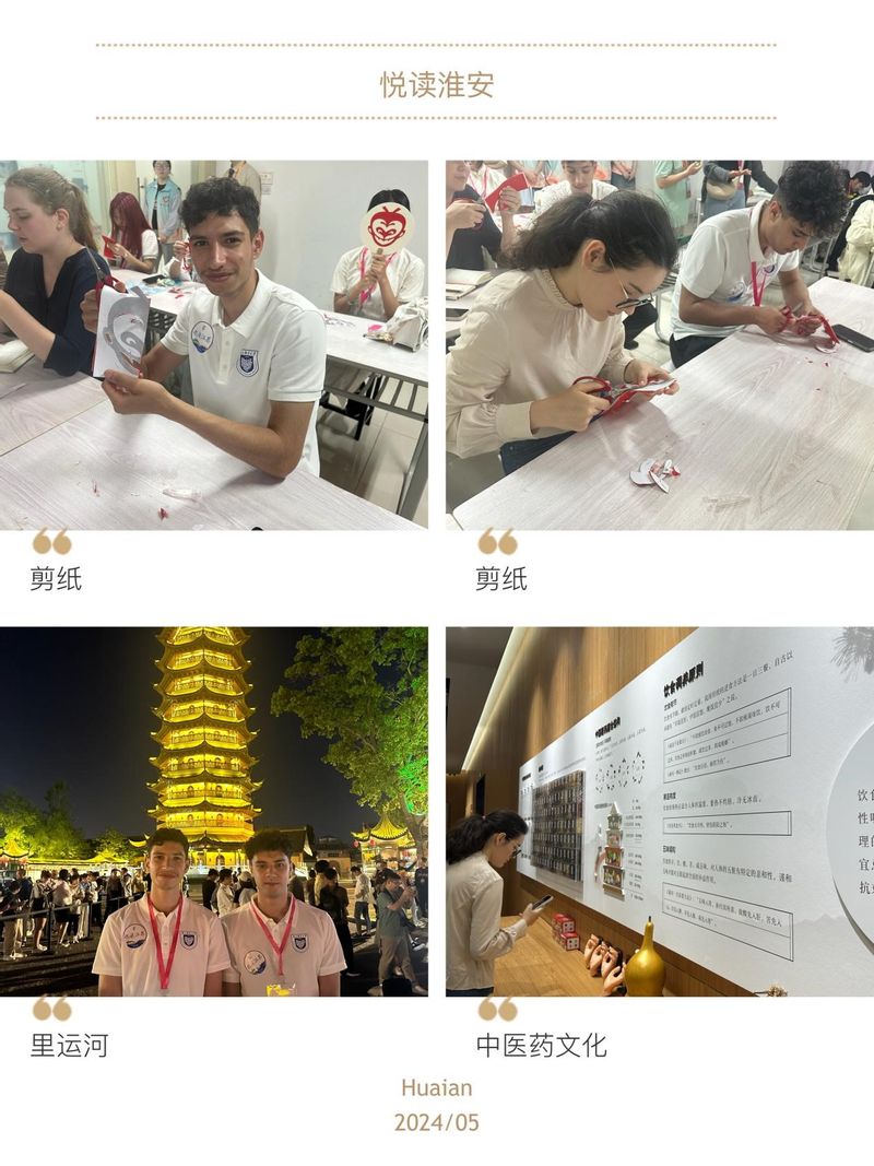 5月18日,中外师生们先来到江苏护理职业学院,共同体验了中医药文化实境课堂,学习八段锦、制作香包、参观中草药标本室等,感受中国中医药文化的博大精深。接着,留学生们分组体验淮安非遗文化的独特韵味,包括剪纸、糖画、漆扇、博里农民画、绒花制作。在老师的指导下,留学生们以《西游记》的主角孙悟空为题材,剪出了活灵活现、生趣盎然的悟空,并在扇面上呈现。最后,留学生们来到了周恩来纪念馆,瞻仰伟人事迹、汲取前进的力量。