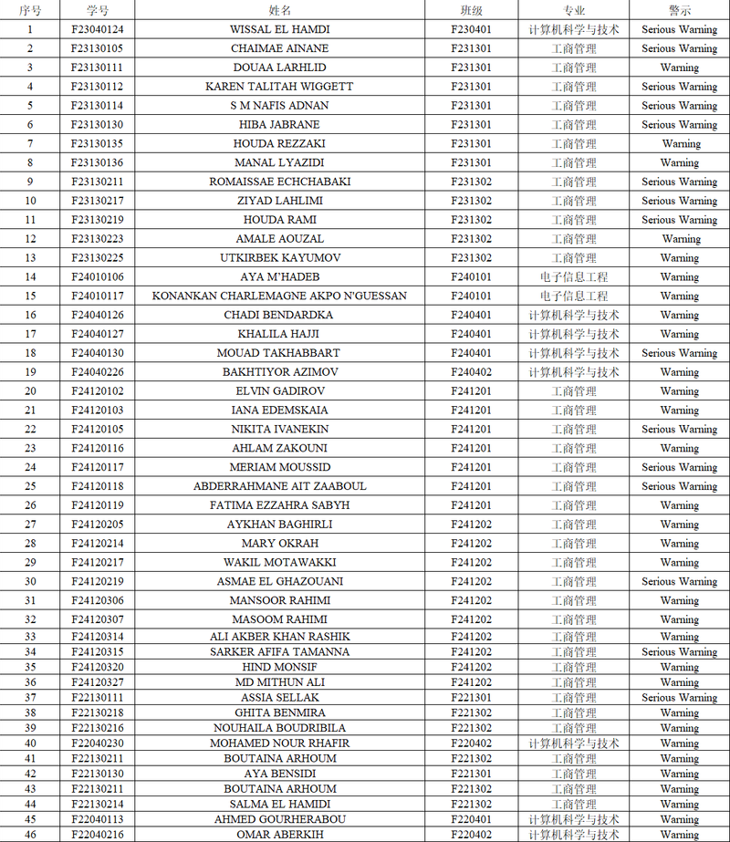 Below is the namelist of the students who were absent from classes seriously without the approval (week 1- week 6). All the mentioned students will be given serious warning or punishment. The attendance of classes will affect the evaluation of scholorship and academic performance.