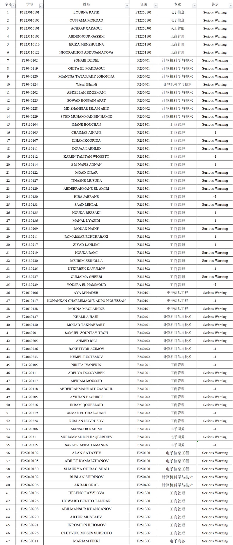 Below is the namelist of the students who were absent from classes seriously without the approval (week 7- week 12). All the mentioned students will be given serious warning or punishment. The attendance of classes will affect the evaluation of scholorship and academic performance.